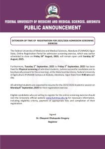 The management of FUMMSA, Abeokuta, Ogun State wishes to inform all candidates and the general public that the online registration portal for the 2025/2026 admission screening exercise, which was earlier scheduled to close on Friday, 29th August 2025, will now remain open until Sunday, 31st August 2025.
