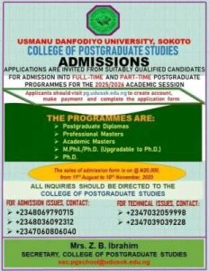 The College of Postgraduate Studies, Usmanu Danfodiyo University, Sokoto (UDUS), invites applications from suitably qualified candidates for full-time and part-time postgraduate programmes for the 2025/2026 academic session.