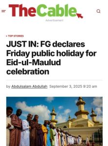 The Federal Government has declared Friday, September 5, 2025, a public holiday to mark Eid-ul-Mawlid, the birth of the Holy Prophet Muhammad.