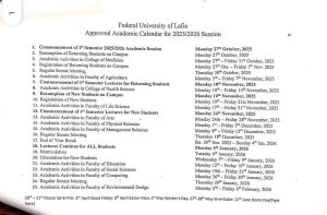 ADMISSION NEWS UNIVERSITY NEWS JUST IN: FULAFIA RELEASES ACADEMIC CALENDAR FOR 2025/2026 SESSION…….. TALLEX September 4, 2025 JUST IN: FULAFIA RELEASES ACADEMIC CALENDAR FOR 2025/2026 SESSION…….. UNIBLOG REPORTS…………. Tags: FULAFIA Continue Reading Previous: UNILORIN RELEASES DAY 3 POSTUTME RESULTNext: KWASU PROPOSED ACADEMIC CALENDAR FOR 2025/2026 SESSION. Leave a Reply Cancel replyYour email address will not be published. Required fields are marked *Comment * Name * Email * Website Save my name, email, and website in this browser for the next time I comment. Related Stories ADMISSION NEWS UNIVERSITY NEWS LAGOS STATE UNIVERSITY [LASU] RELEASES DIRECT ENTRY ADMISSION LIST ON SCHOOL PORTAL FOR THE 2025/2026 ACADEMIC SESSION DEMPSY October 18, 2025 UNIVERSITY NEWS LASU RELEASES SECOND BATCH OF MATRICULATION NUMBERS FOR NEWLY ADMITTED AND CLEARED STUDENTS DEMPSY October 16, 2025 UNIVERSITY NEWS LAGOS STATE UNIVERSITY, (LASU) ACTIVATES SCHOOL FEES AND OTHER FEES PAYMENTS PORTAL FOR NEWLY ADMITTED FULL-TIME STUDENTS FOR THE 2025/2026 ACADEMIC SESSION DEMPSY October 10, 2025