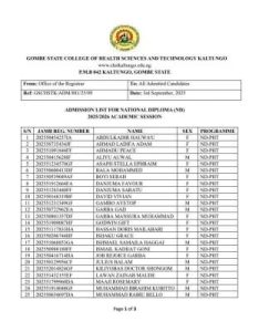 This is to notify the general public, particularly prospective students, that the management of Gombe State College of Health Sciences and Technology, Kaltungo has released the National Diploma (ND) admission list for the 2025/2026 academic session.