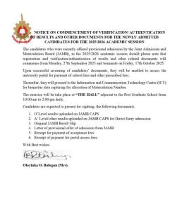 ADMISSION NEWS UNIVERSITY NEWS JUST IN:LAUTECH ISSUED NOTICE ON COMMENCEMENT OF VERIFICATION AUTHENTICATION OF RESULTS AND OTHER DOCUMENTS FOR NEWLY ADMITTED CANDIDATES FOR THE 2025/2026 ACADEMIC SESSION ISRAEL OMONIYI September 24, 2025 Tags: LADOKE AKINTOLA UNIVERSITY OF TECHNOLOGY (LAUTECH) Continue Reading Previous: JUST IN:LADOKE AKINTOLA UNIVERSITY OF TECHNOLOGY (LAUTECH) BEGINS UPLOADING OF DIRECT ENTRY (DE) ADMISSION LIST ON JAMB CAPS FOR 2025/2026 ACADEMIC SESSIONNext: JUST IN:CHUKWUEMEKA ODUMEGWU OJUKWU UNIVERSITY (COOU) EXTENDS POST UTME APPLICATION DEADLINE FOR THE 2025/2026 ACADEMIC SESSION Leave a Reply Cancel replyYour email address will not be published. Required fields are marked *Comment * Name * Email * Website Save my name, email, and website in this browser for the next time I comment. Related Stories ADMISSION NEWS UNIVERSITY NEWS LAGOS STATE UNIVERSITY [LASU] RELEASES DIRECT ENTRY ADMISSION LIST ON SCHOOL PORTAL FOR THE 2025/2026 ACADEMIC SESSION DEMPSY October 18, 2025 UNIVERSITY NEWS LASU RELEASES SECOND BATCH OF MATRICULATION NUMBERS FOR NEWLY ADMITTED AND CLEARED STUDENTS DEMPSY October 16, 2025 UNIVERSITY NEWS LAGOS STATE UNIVERSITY, (LASU) ACTIVATES SCHOOL FEES AND OTHER FEES PAYMENTS PORTAL FOR NEWLY ADMITTED FULL-TIME STUDENTS FOR THE 2025/2026 ACADEMIC SESSION DEMPSY October 10, 2025