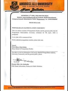 The University Management sincerely regrets any inconvenience this postponement may cause to parents, sponsors, employers, and other well-wishers who had made travel and other arrangements to attend the ceremony.