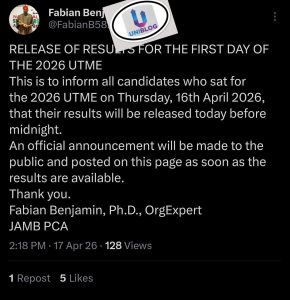 The Joint Admissions and Matriculation Board (JAMB) has announced that the results of candidates who participated in the first day of the 2026 Unified Tertiary Matriculation Examination (UTME) will be released before midnight today, Friday, April 17, 2026.