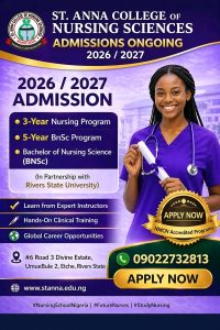 This is to formally inform the general public, particularly prospective students, parents, and guardians, that St. Anna College of Nursing Sciences, Etche, Rivers State, has officially commenced the sale of admission forms for the 2026/2027 academic session.